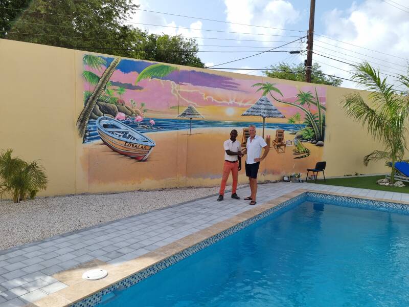 Wendel, aka Wen, he is the man who left us with that beautiful painting on the wall behind the pool. Wendel is active as a car painter, painter and musician and a creative thinking person. We are really proud and happy with the result. His phone no. is +599-9-694-7675 (but beware, Wendel himself does not have a mobile phone, this number belongs to his wife!)